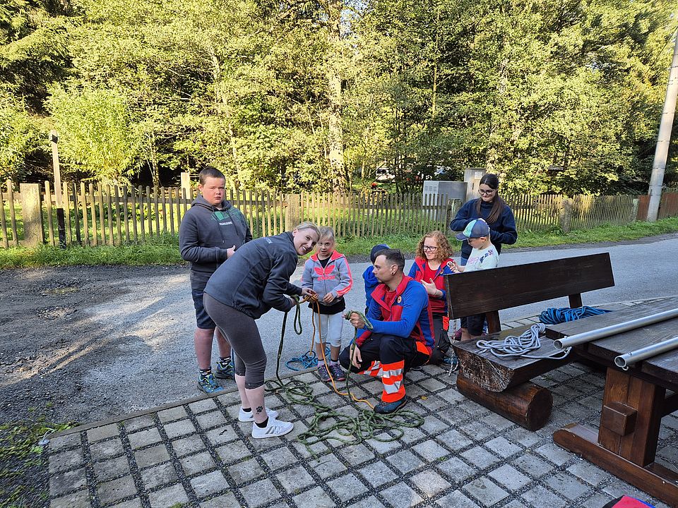 Am Samstag, den 20. September 2025 unternahm das Jugendrotkreuz Sebnitz einen Ausflug zur Bergwachthütte im Bielatal. Bei strahlendem Spätsommerwetter erwartete die Kinder und Betreuer ein abwechslungsreicher Tag voller neuer Eindrücke. An mehreren Stationen hatten die Bergretter spannende Aktionen vorbereitet: Die Kinder konnten verschiedene Knoten ausprobieren, das Abseilen einer Schleifkorbtrage üben und bekamen moderne Rettungstechnik anschaulich vorgestellt. Alles war sehr interessant, und die jungen Teilnehmer konnten eine Menge dazulernen. Zum Mittagessen gab es für alle Nudeln, die von der Bergwacht frisch gekocht wurden. Zum Abschluss spendierten die Betreuer den Kindern ein Eis – bei der Wärme ein besonders gelungener Ausklang des schönen Tages. Das Jugendrotkreuz bedankt sich herzlich bei der Bergwacht für die Vorbereitung und Unterstützung dieses gelungenen Ausflugs.