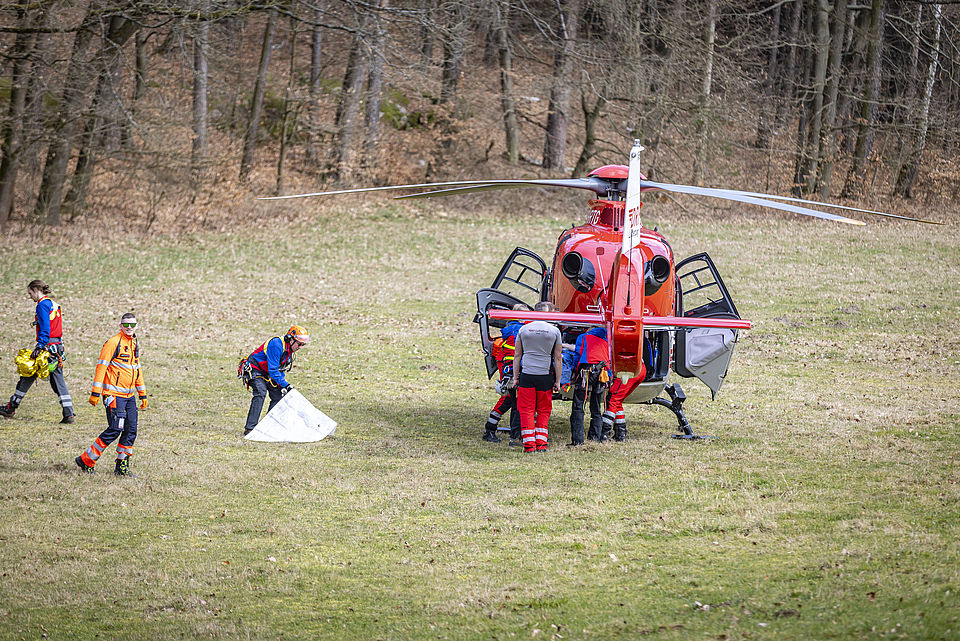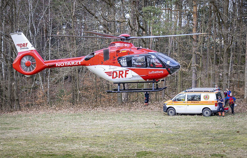 Ein Kletterausflug in der Sächsischen Schweiz endete am vergangenen Wochenende mit einem Rettungseinsatz im Gebiet der Bärensteine nahe Naundorf. Gegen 12:09 Uhr wurde die Bergwacht Pirna zu einem Unfall an der Bärensteinnadel alarmiert. Eine 23-jährige Kletterin hatte beim Vorstieg an der Nordwestkante den Halt verloren und war in die Tiefe gestürzt. Dass die junge Frau nicht bis auf den Boden aufschlug, verdankt sie ihren Zwischensicherungen: Zwei von ihr gelegte Knotenschlingen hielten der Belastung stand und stoppten den Fall nach etwa acht Metern. Dennoch prallte die Kletterin während des Sturzes gegen den Felsen. Da sie keinen Kletterhelm trug, zog sie sich diverse Kopfverletzungen zu – ein Helm hätte die Schwere dieser Verletzungen in diesem Fall vermutlich deutlich reduziert. Die Einsatzkräfte des DRK-Rettungsdienstes Pirna trafen zuerst am Unfallort ein und übernahmen die medizinische Erstversorgung. Aufgrund der schwierigen Geländesituation und des erforderlichen Transports bergauf wurde zusätzlich die Bergwacht Dresden zur Unterstützung angefordert. Diese befand sich zufällig mit einer Übungsmannschaft am nahegelegenen Rauenstein und konnte schnell zur Hilfe eilen. Die Patientin wurde mittels Gebirgstrage durch das steile Gelände zum Landeplatz gebracht. Dort erfolgte die Übergabe an die Besatzung des Rettungshubschraubers „Christoph 38“, der die Frau zur weiteren Behandlung in eine Dresdner Klinik flog.