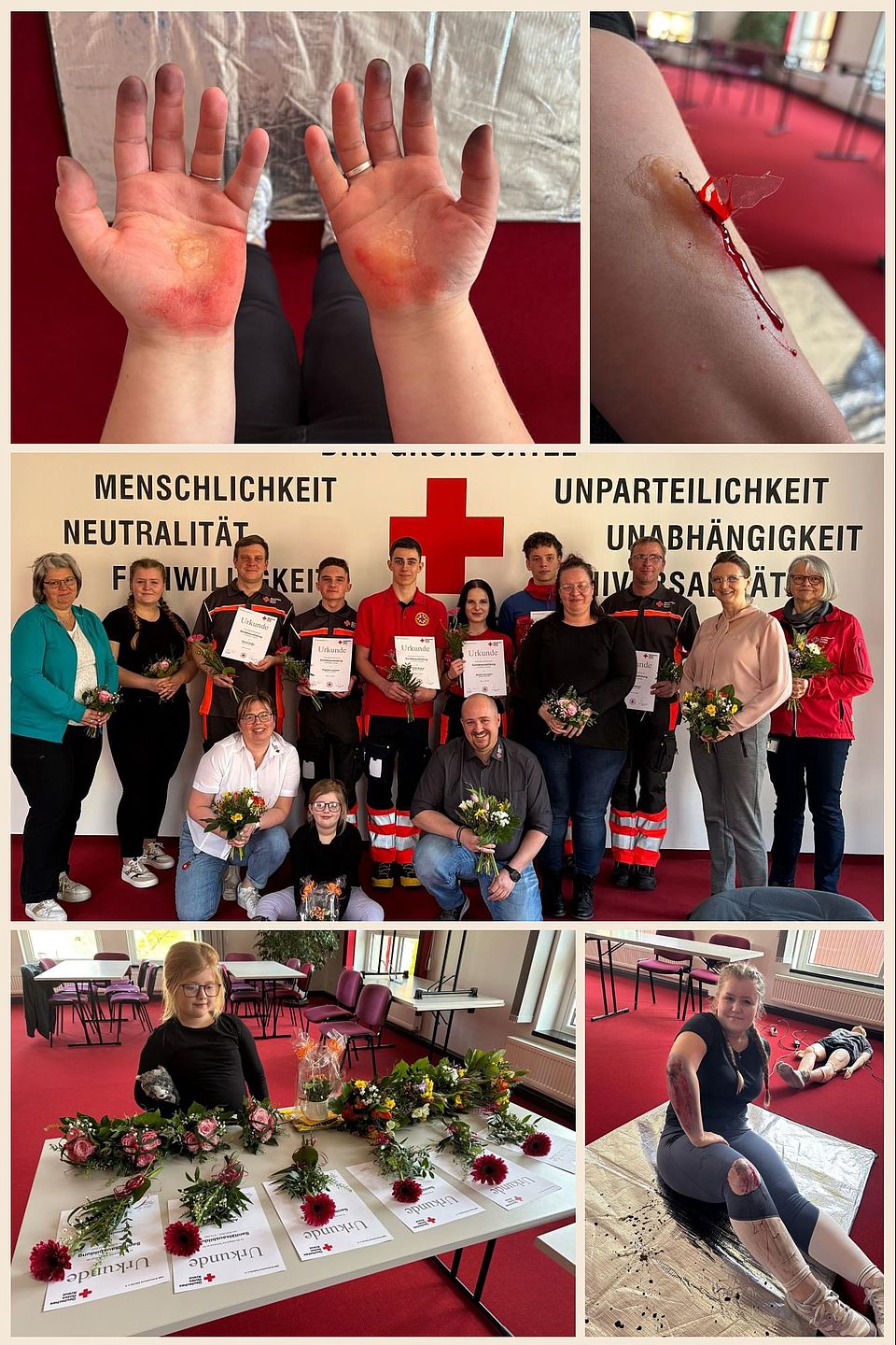 Ein herzliches Dankeschön an unseren Vorstand Frau Rita Seidel und unsere Kreisverbandsärztin Frau Dr. med. Ina Bialk für die Zeit, welche sie sich für die Bewertung der Prüflinge genommen haben. Ein besonderer Dank gilt Frau Jirina Ringel und Herrn Eike Hirsch für ihren unermüdlichen Einsatz als Ausbilder in den letzten sechs Wochen. Zuletzt möchten wir uns bei den Opferdarstellerinnen Steffi mit Tochter Emma und Johanna bedanken..